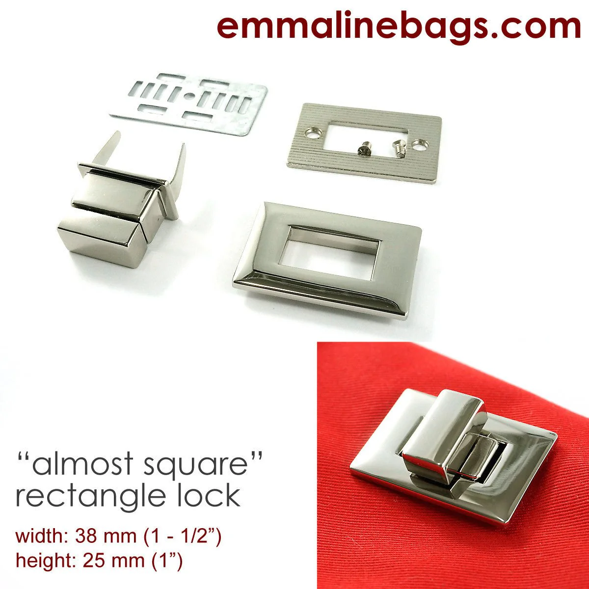 Large, rectangle turn locks especially made for Emmaline Bags. These heavy, high quality turn locks are of superb quality and will make a statement on any of your handmade bags and purses. Easy to install with included screws to attach the front and back plates together onto the front flap, and a metal washer to connect turning (twist) part onto the bag/wallet body. Installation instructions available HERE.