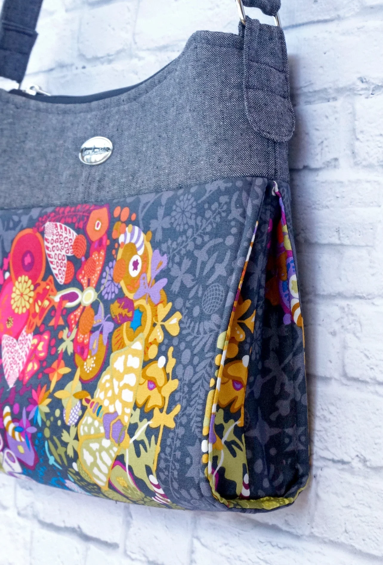 The Gabby Bag features exterior & interior zipper pockets, as well as an interior double slip pocket. Its single shoulder strap is approximately 34” (86 cm) long, but you can lengthen or shorten it to suit your own style. If you’d like to add rivets to your bag, a placement diagram is shown on the last page of the instructions. The Gabby was the April bag for the 2016 Bag of the Month club and now is available for individual resale!