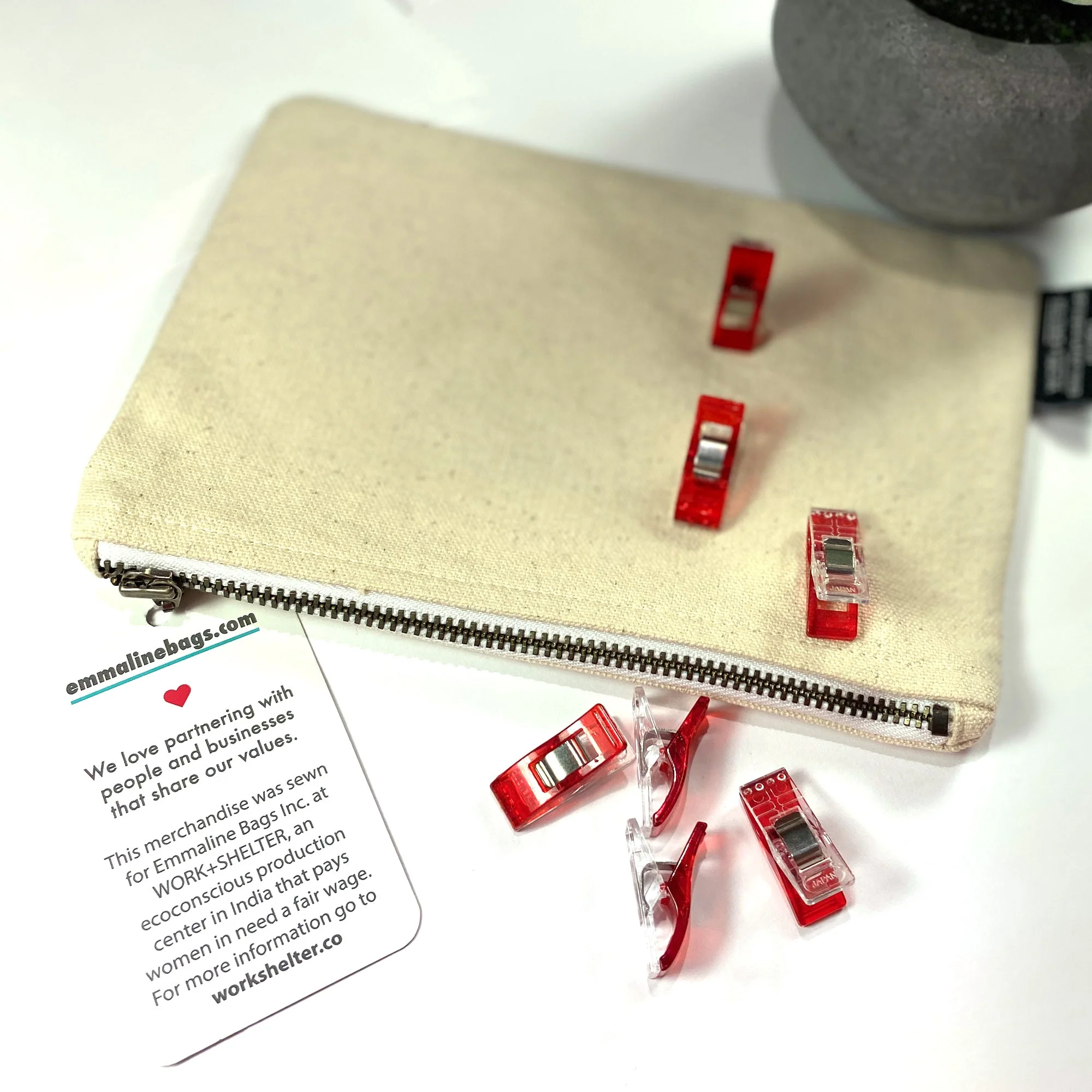 An organic cotton, high quality, ethically made, zipper pouch that is perfect for all of your riveting tools, and Emmaline double-cap rivets & chicago screws. This pouch was made for Emmaline by the ladies at Work+Shelter!